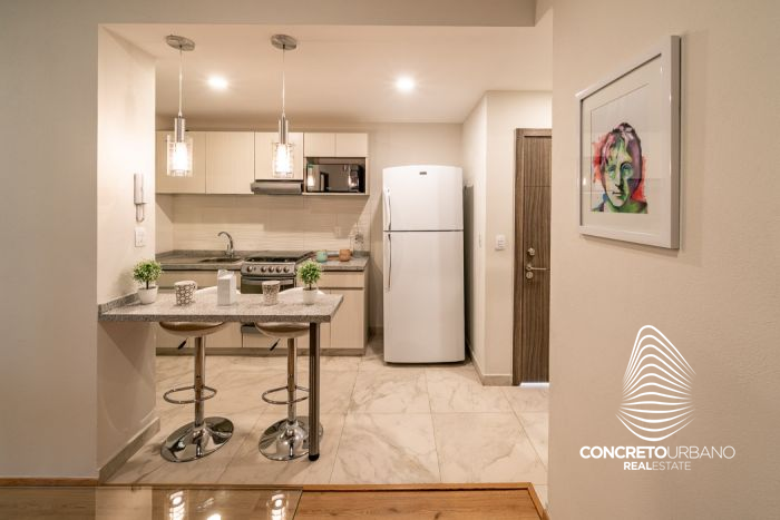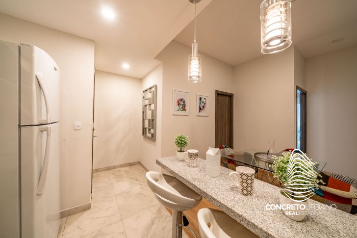 Cocina abierta con barra desayunadora con cubierta de granito